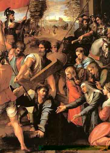 Cargado con la cruz de salvación camina el redentor, desamparado, es el justo, por odio condenado a morir, acusado de traición.