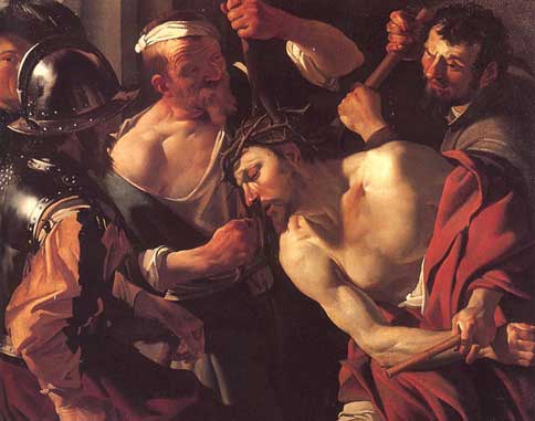 Con espinas taladran su cabeza coronándole rey de los judíos y por cetro le entregan una caña.